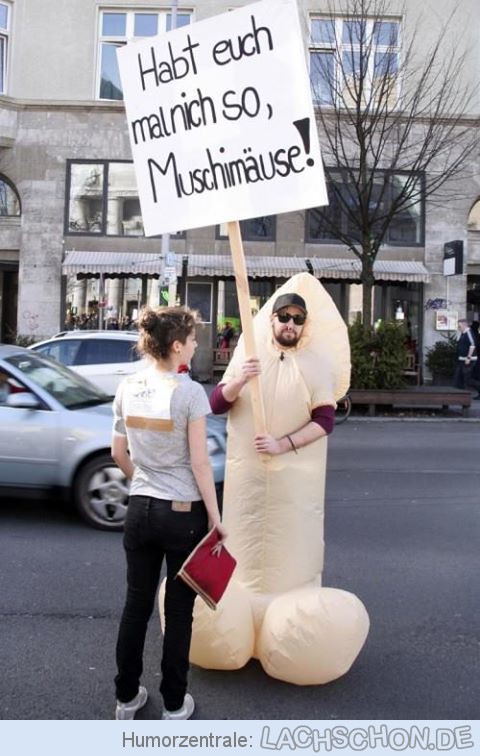 "Muschimäuse! Demonstriert lieber eure Kochkünste als für irgend so'nen Scheiß!" meint dieser Gegendemonstrant bei einer Weltfrauentagsdemo. "Ich erwarte euch zum Schni-Blow-Tag daheim!" Zum Schnitzel-Blowjob-Tag nämlich. "Damit könnt ihr euer Mäulchen voll nehmen! Nicht mit dem Maulen irgendwelcher Parolen!"
